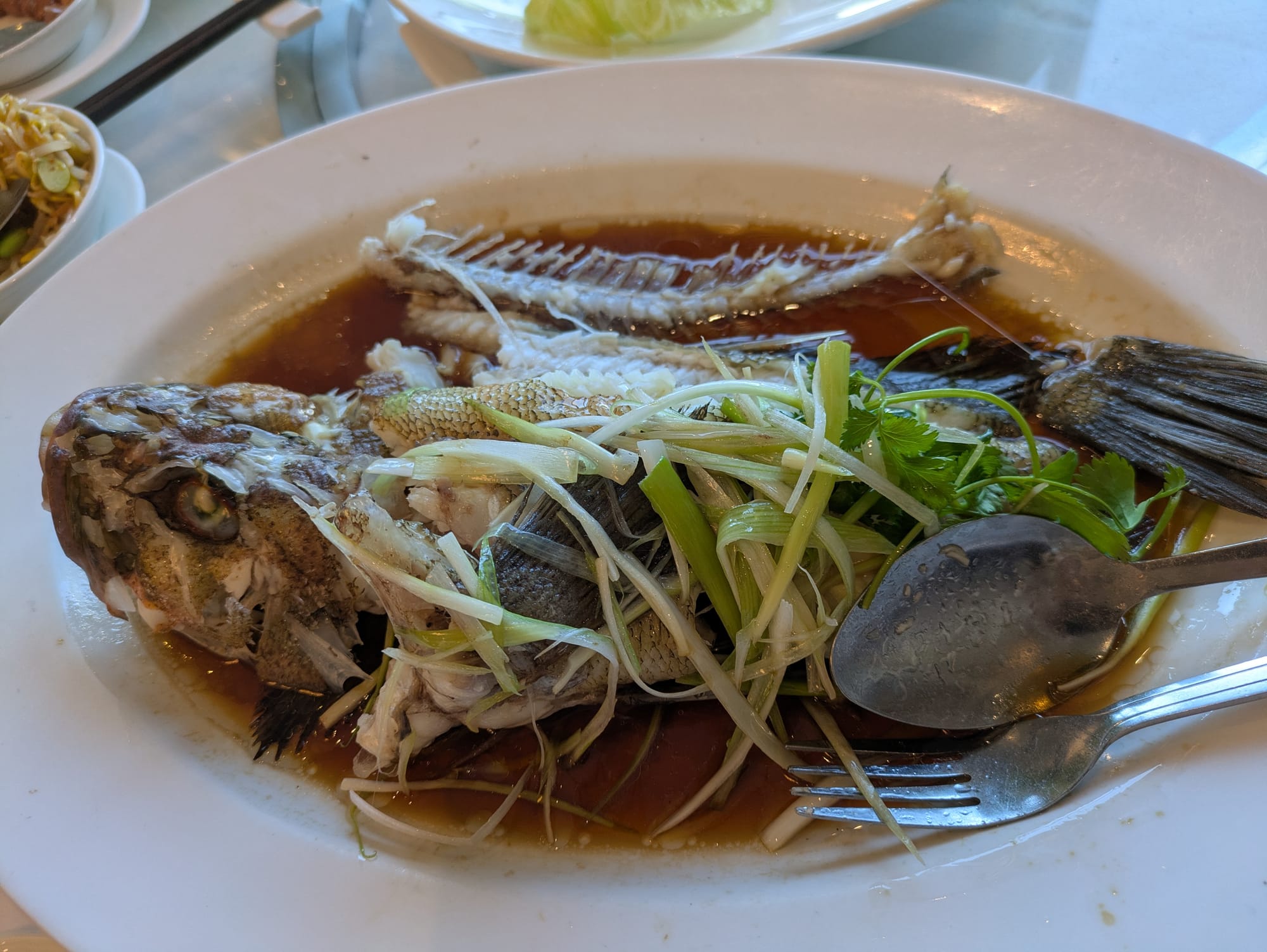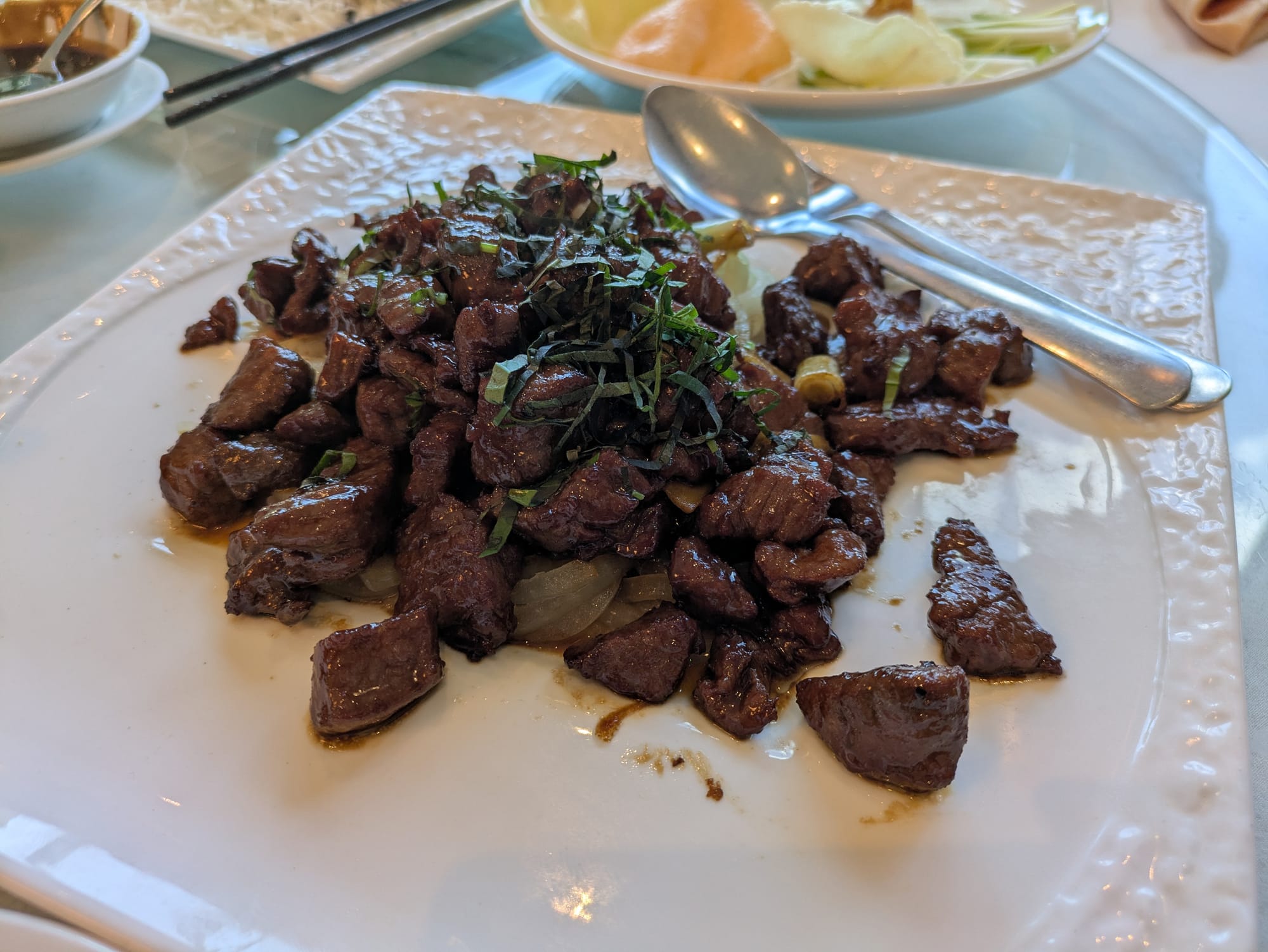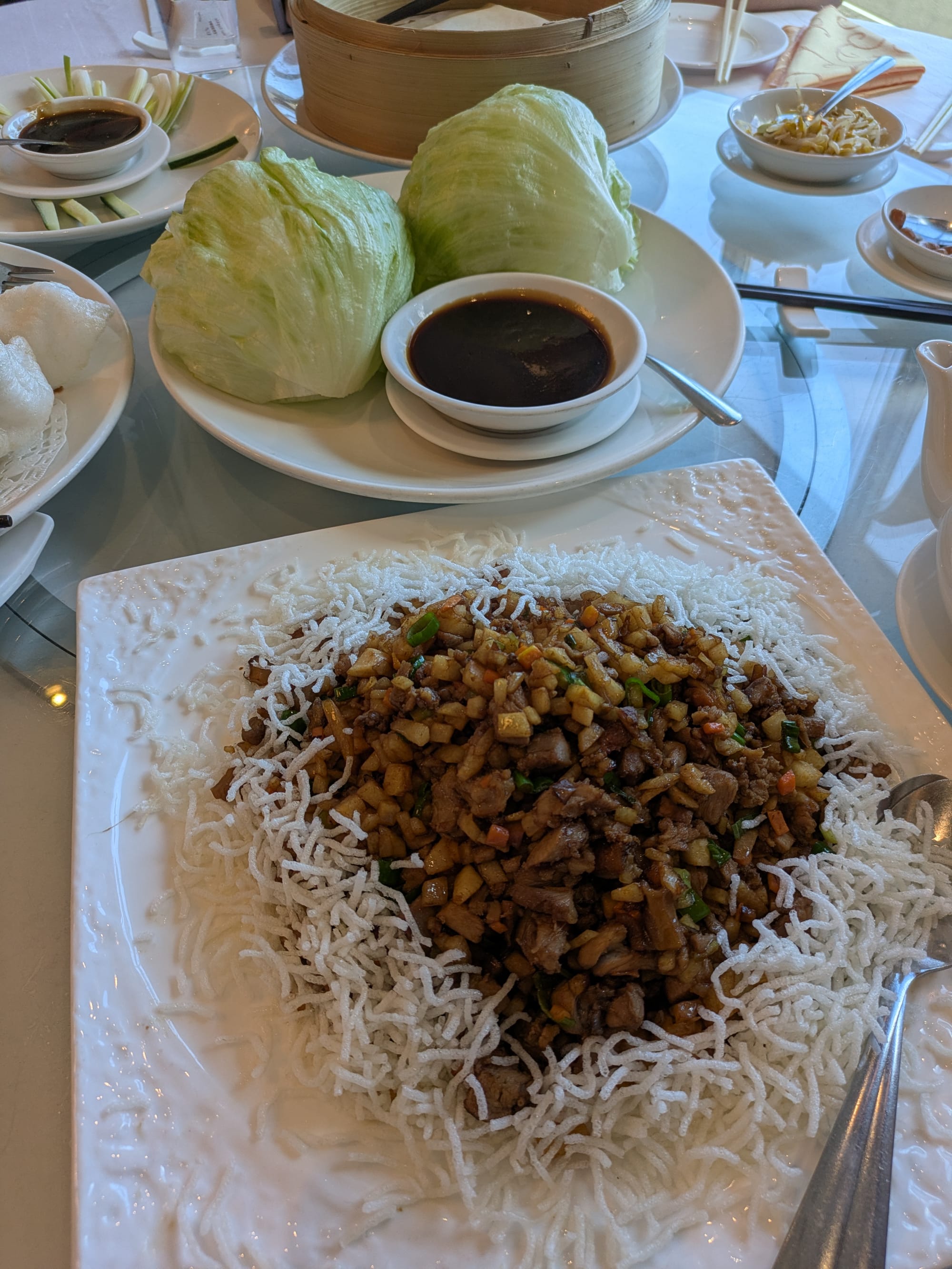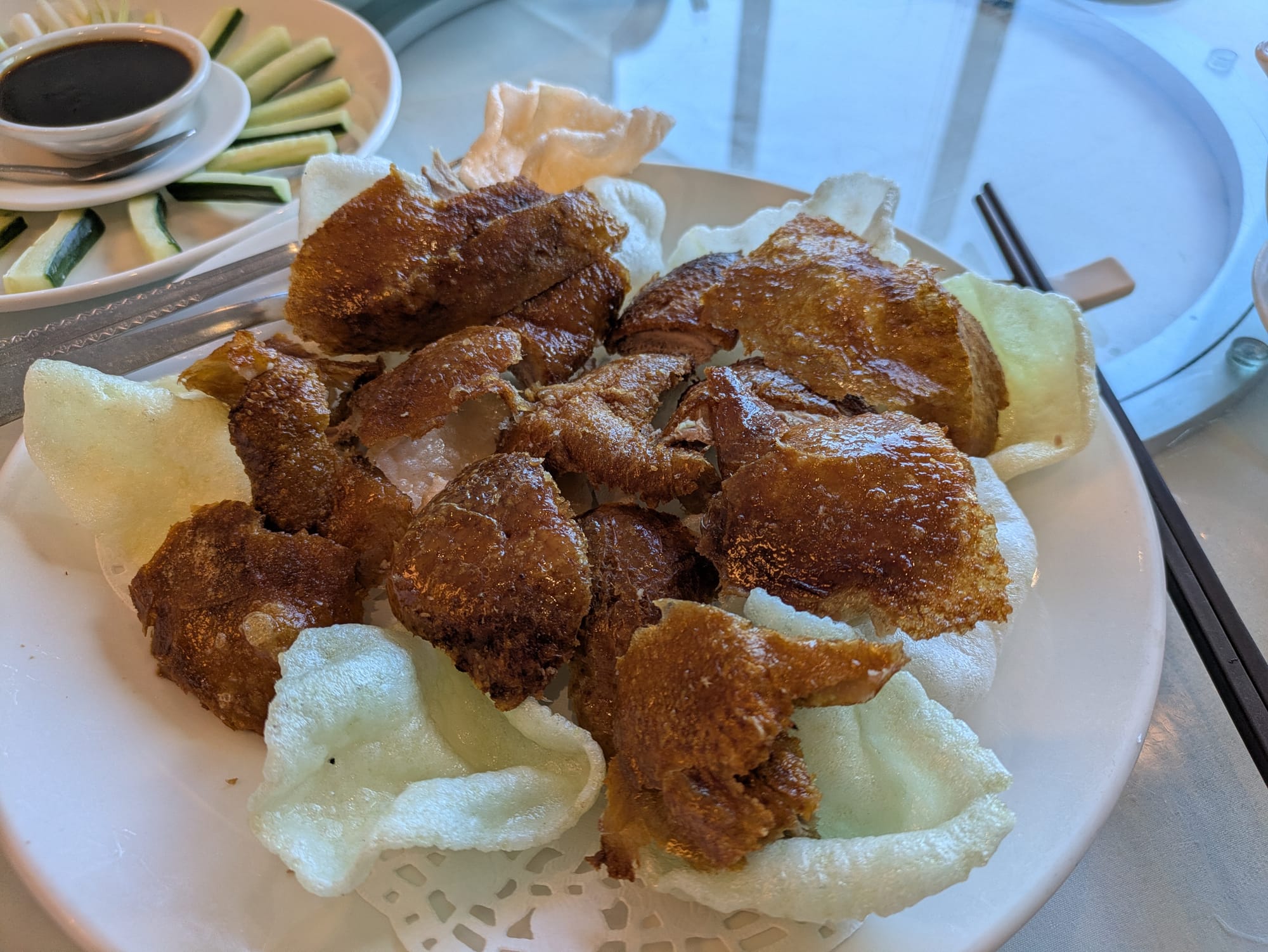 Our opinion? It was ok. The duck skin was really crispy and the wraps were really good but we're not sure it's totally worth the premium price. But we also had lettuce wraps, some beef dish, and some steamed fish that were all super good. The fish was so fresh and they said it was caught really recently. So at least a bunch of the other food was top notch. Also the place is Michelin Guide. It is called Dynasty.