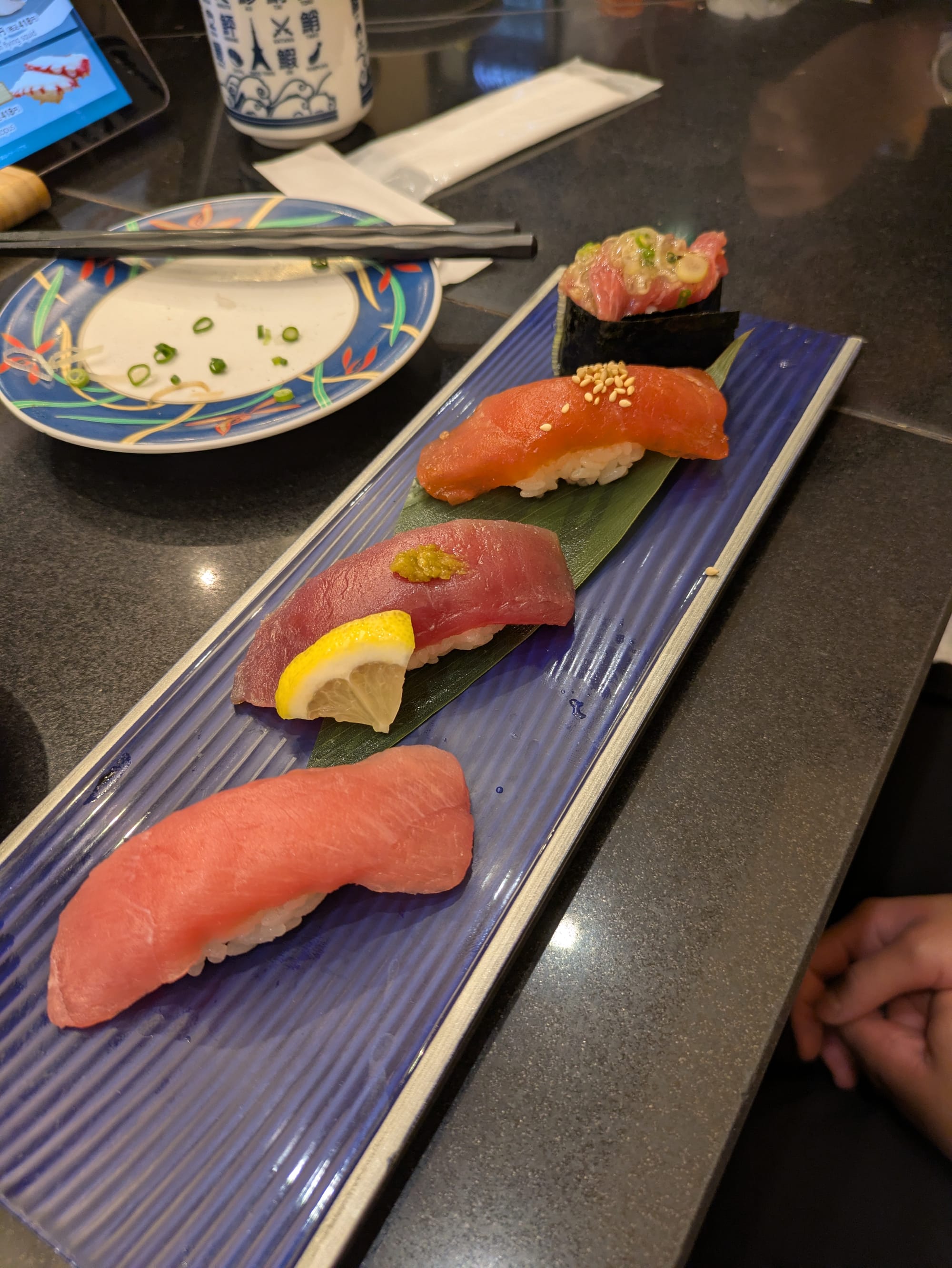 Amelia and Rita went back to Ueno station to drop off their purchases at our hotel. They ended up staying there for a couple of hours resting. They basically missed lunch, and so after those hours, they went out, back to Ueno to eat at a conveyor belt sushi restaurant. It was so yummy!