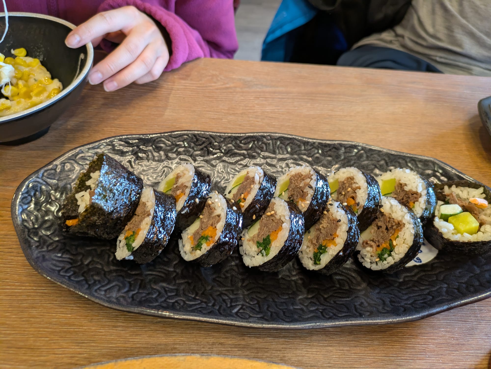 After lunch we craved Korean food, and we went to a restaurant called Sandeul. It was so satisfyingly good. We got soup, cheese corn, gimbap, hot-stone bibimbap, and galbi! 😋